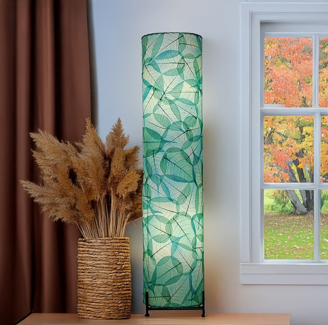 A crisp 5.5 x 12 inch column wrapped in real leaves. It behaves like architecture, vertical, quiet, intentional, and then it lights up and flatters everything around it. Leaf veins read as texture, not fuss. Clean silhouette, natural material, all glow with no clutter.
