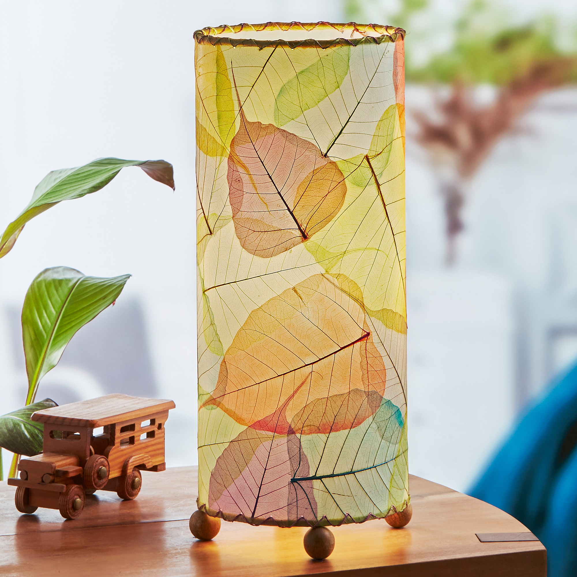 The Banyan Table Lamp takes its name and spirit from the tree of stillness and shelter. Its form is simple: a clean cylinder resting gently on rounded wooden feet. But within that simplicity lies something intricate and alive. Hand-placed banyan leaves overlap in soft, organic layers, creating a natural mosaic of shadows and light. The closer you get, the more you see—delicate veins, soft edges, careful craftsmanship.