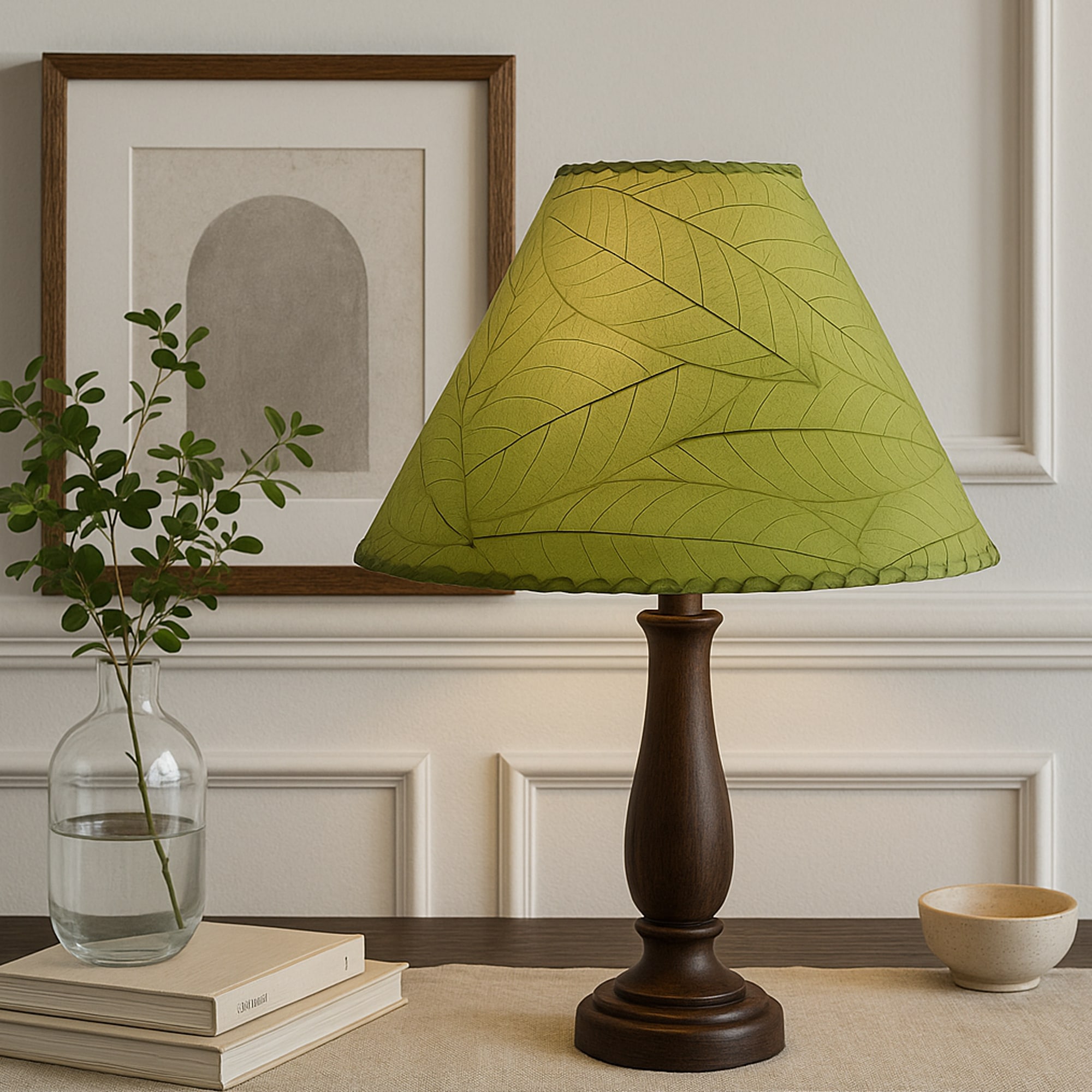 Each shade is handcrafted from real fossilized cocoa leaves—selected for their structure, layered with care, and preserved to highlight every beautiful vein. Laminated onto a backing using water-based adhesive and handstitched to a sturdy wrought iron frame, the shade brings soft light and natural texture to your space. The wide, flared shape provides excellent light diffusion, creating a gentle ambient glow perfect for cozy evenings or relaxed reading.