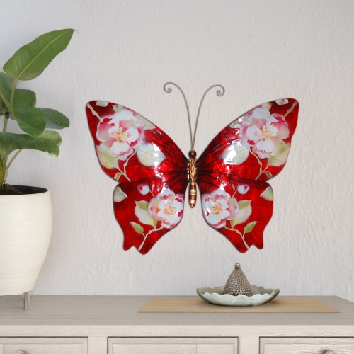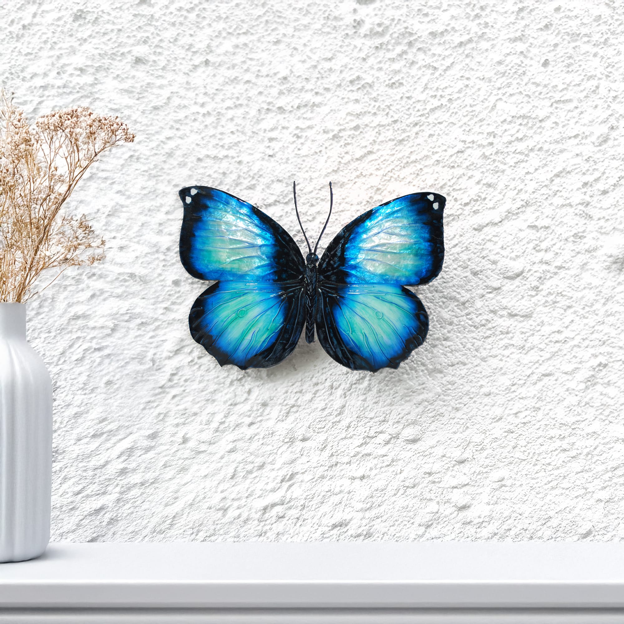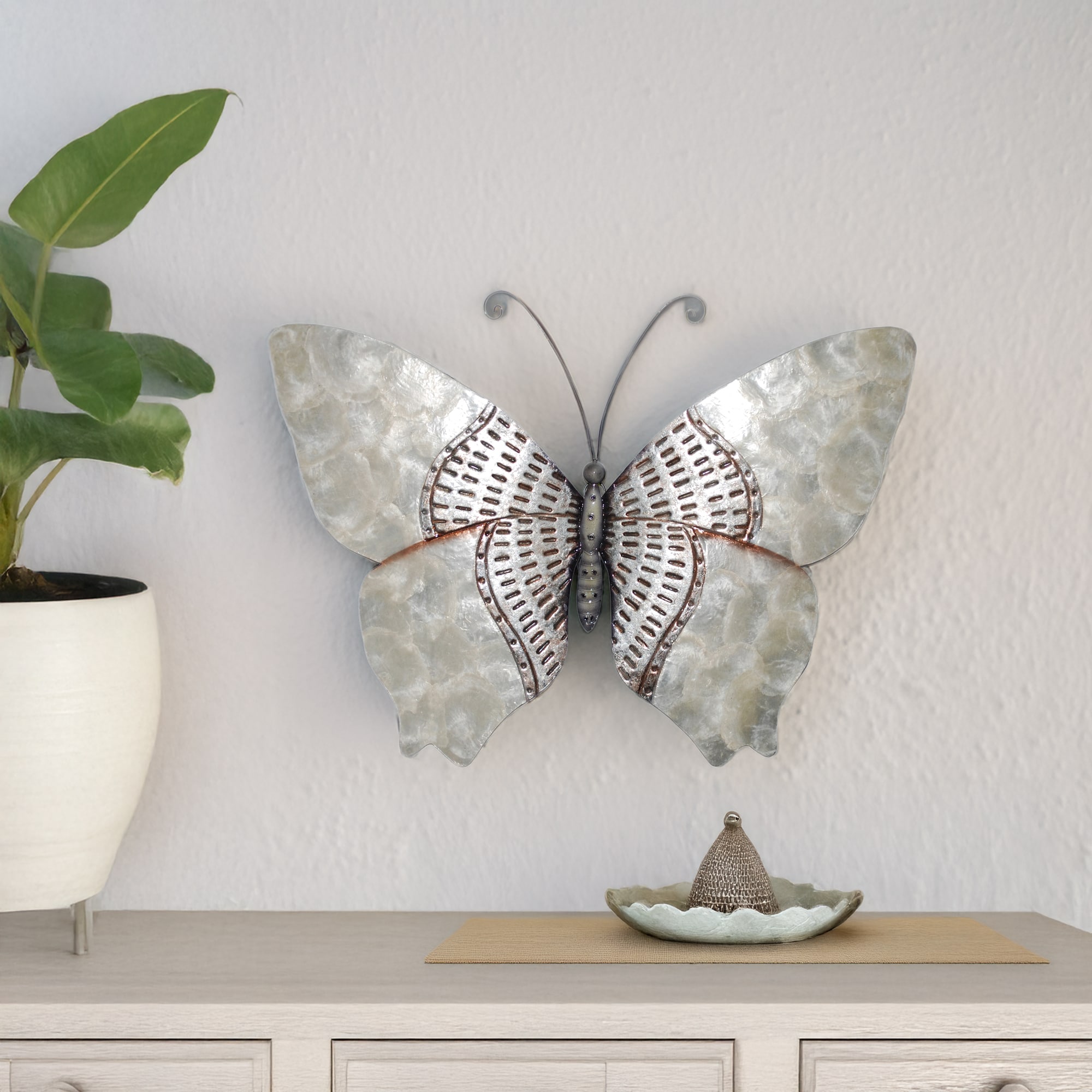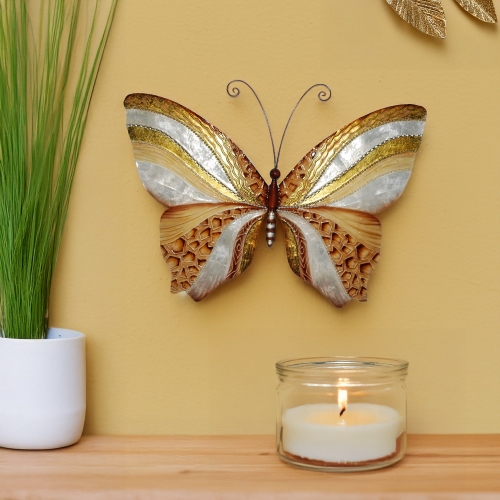 The basic frame of the butterfly is created using tin, which is powder-coated with a black finish and makes this piece safe to use outdoors. The edges of the frame are reinforced using thicker tin wire. The front of this piece is adorned in areas with capiz shell, an oyster native to the Philippines, before being hand-painted and sealed with a water-based sealant. The primary purpose of this oyster to provide a source of food, however, the shell is a sustainable by-product that can be used for decoration. The capiz shell subtly replicates the reflective qualities of butterflies in nature. The entire piece is lightweight and has an eyelet in the back allowing it to be hung using a finishing nail, command strip, or a push pin.