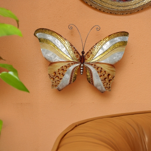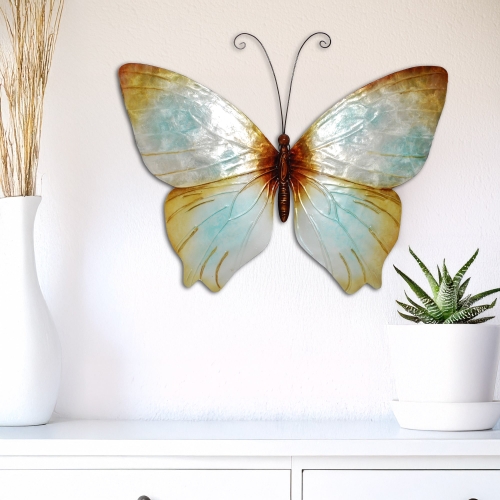 The aqua color of this butterfly and the capiz shell complement each other in such a way that it almost looks like one is looking at cobalt glass. This color is accentuated by the copper tone bordering the aqua centers. This is truly an impressive piece combining natural materials and colors and creating something breathtaking. The upper wing adorned in capiz is contrasted by the handcrafted metal lower wing. Both components meld together for a piece that showcases the artists talents.