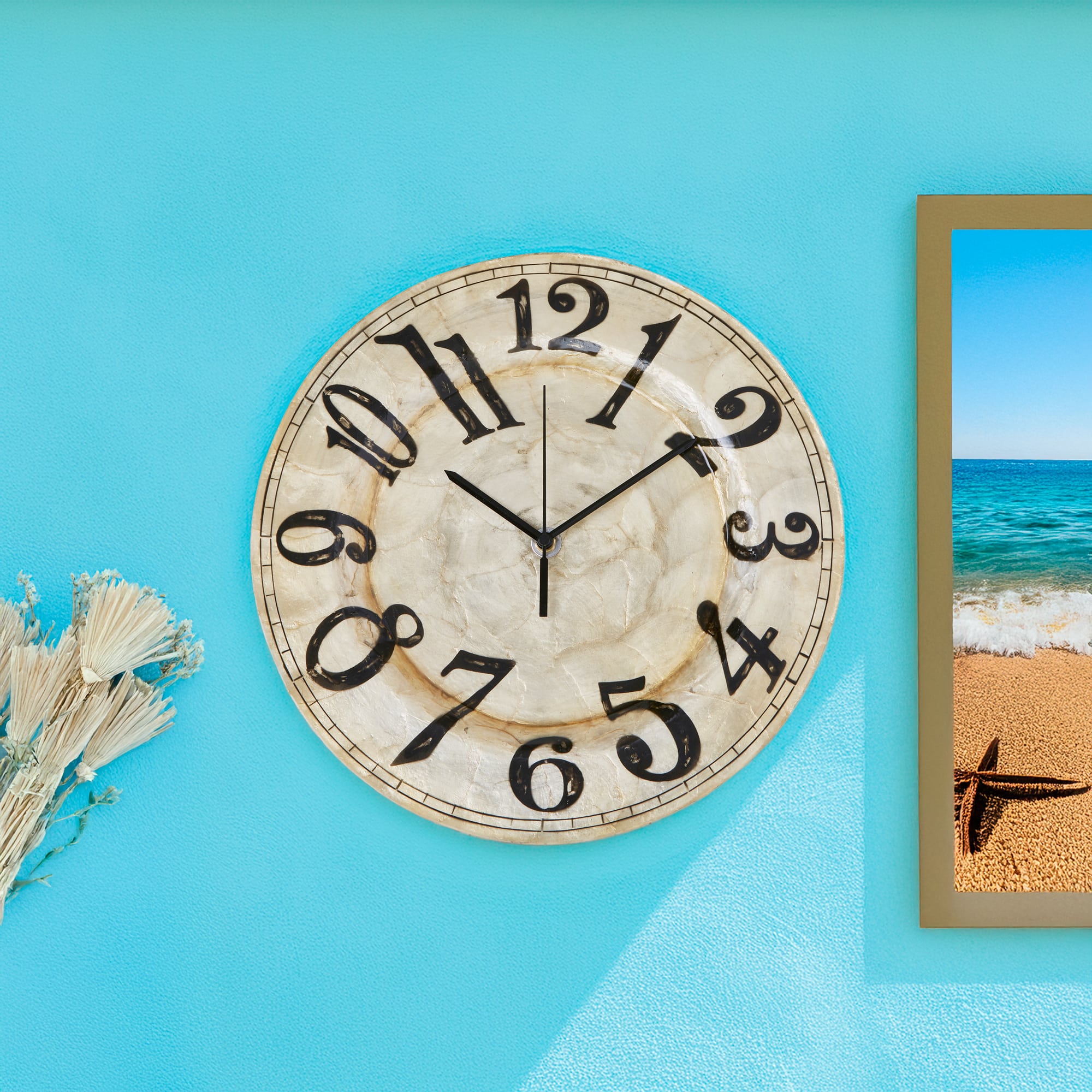 The frame of this clock is made with solid capiz oyster shell, compressed into shape. The face is hand-painted to appear as if it is aged porcelain, promoted by the natual colors of the capiz shell. The look is further accentuated by gentle distressed marks. The black, bold numbers vary in size and stand in strong contrast to the pearl background. The combination of simple color palette and the seasoned feel of the porcelain finish are quintessential hallmarks of the modern farmhouse design genre.