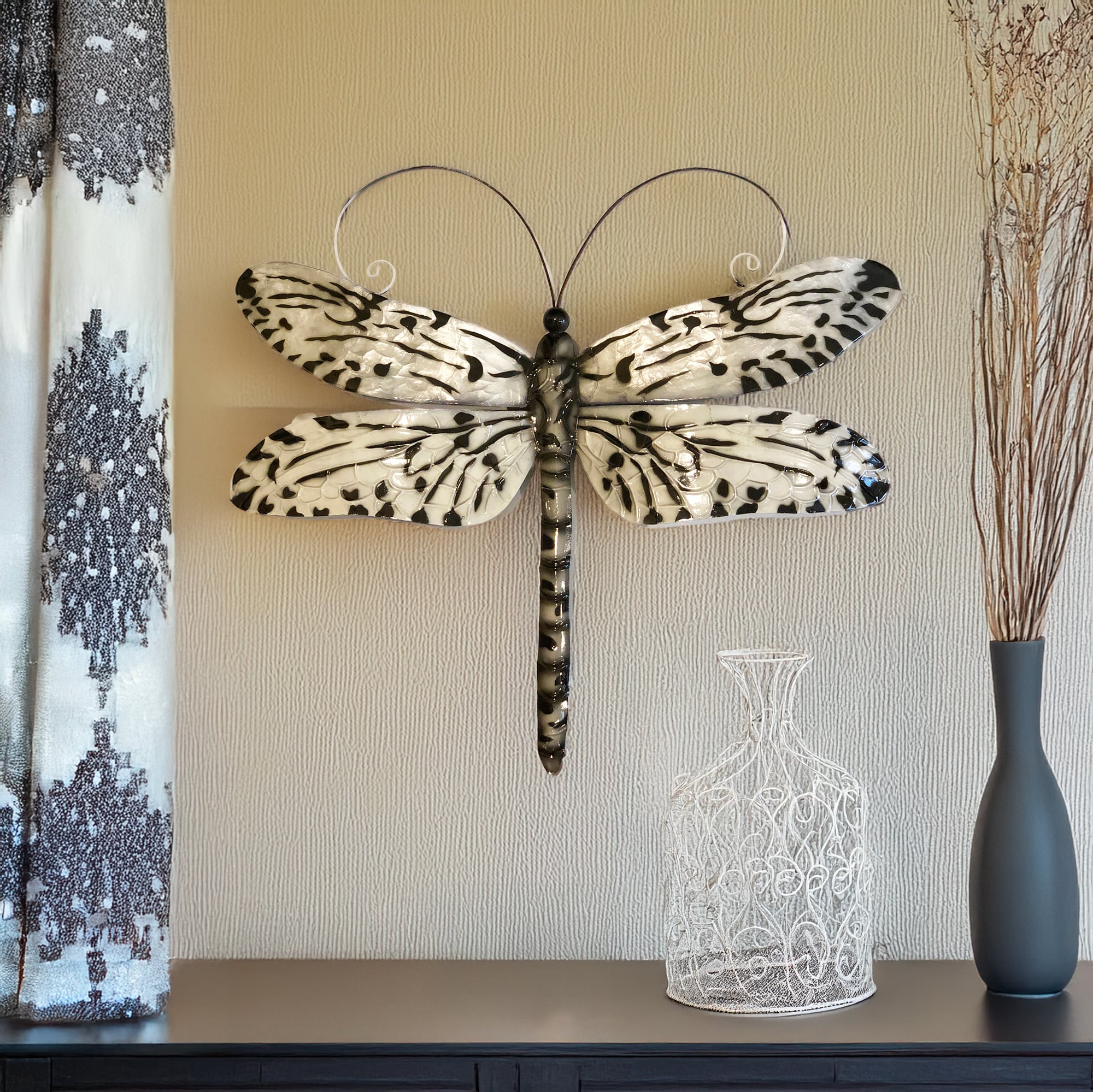 The basic frame of the dragonfly is created using tin, which is powder-coated with a black finish and makes this piece safe to use outdoors. The edges of the frame are reinforced using thicker tin wire. The front of this piece is adorned in areas with capiz shell, an oyster native to the Philippines, before being hand-painted and sealed with a water-based sealant. The primary purpose of this oyster to provide a source of food, however, the shell is a sustainable by-product that can be used for decoration. The capiz shell subtly replicates the reflective qualities of dragonflies in nature. The entire piece is lightweight and has an eyelet in the back allowing it to be hung using a finishing nail, command strip, or a push pin.