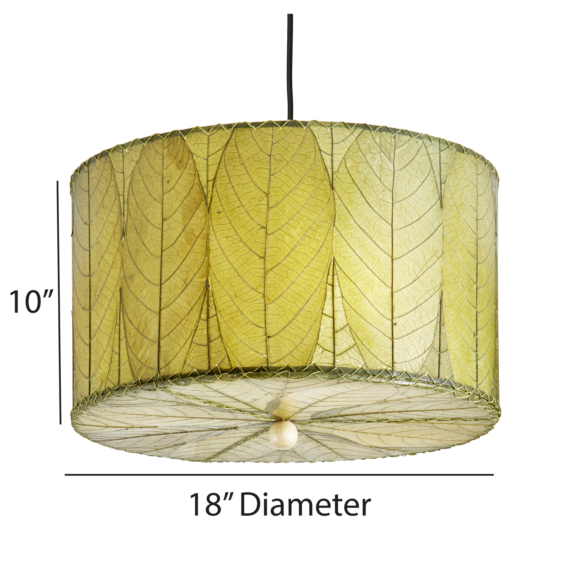 The 18-Inch Drum Pendant blends natural texture with mid-century simplicity—elevating your space with warmth, symmetry, and an unexpected touch of nature. Its classic shape anchors the room, while the hand-laid cocoa leaves glow from within, bringing softness to clean lines and depth to open air.