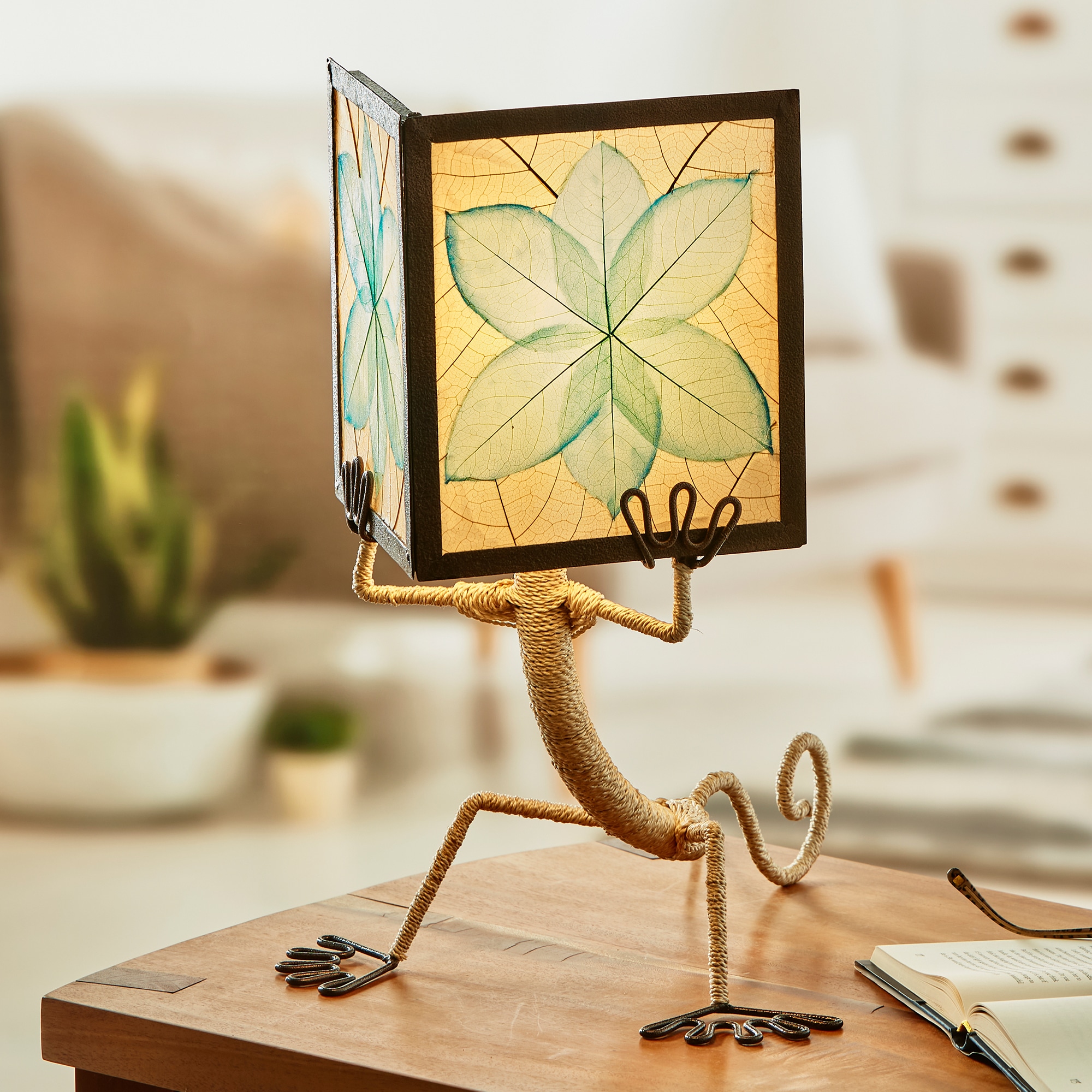 The Enlightened Gecko Table Lamp is pure personality—clever, curious, and completely charming. Caught mid-study, this lamp captures the playful energy of a lizard with its nose in a book. Its frame—crafted from wrought iron and wrapped in natural abaca—gives the gecko lifelike movement, while the lamp shade doubles as its reading material, glowing softly with fossilized leaves.