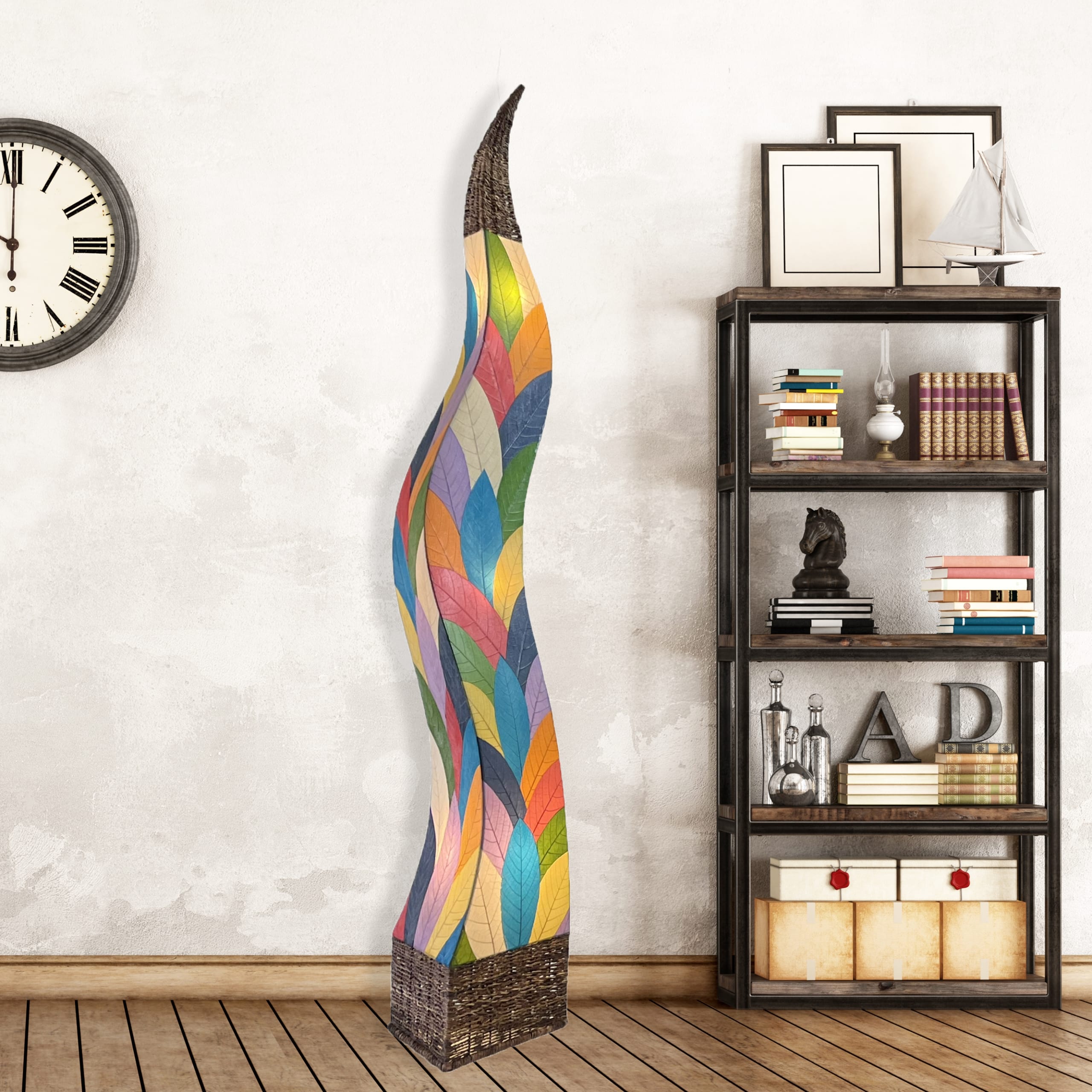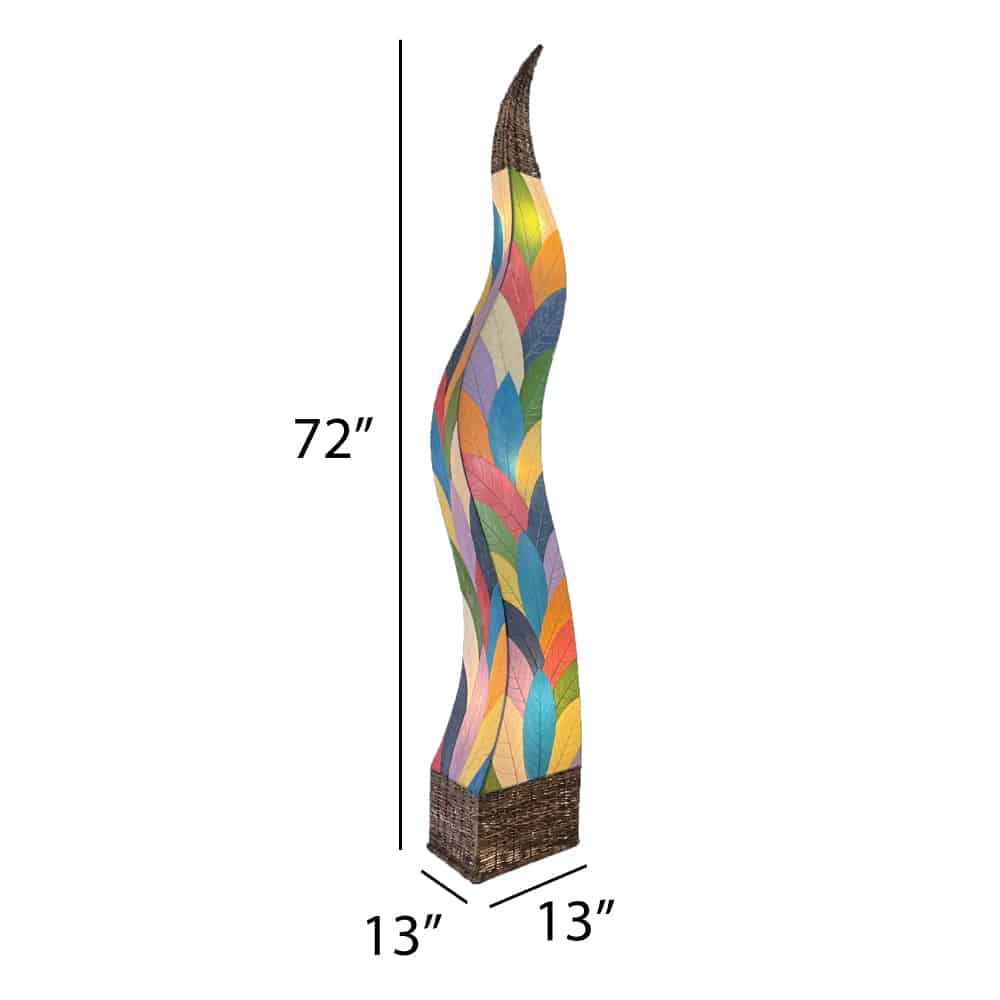 The Flame Giant Lamp is a celebration of humanity’s oldest light: fire. Its curved silhouette sways like a flickering flame—elegant, primal, alive. From its woven base to its arcing tip, the lamp evokes the story of warmth, protection, and transformation. At its heart are real cocoa leaves, preserved and dyed in rich, earthy hues, then hand-placed to create glowing texture across the sculptural frame.