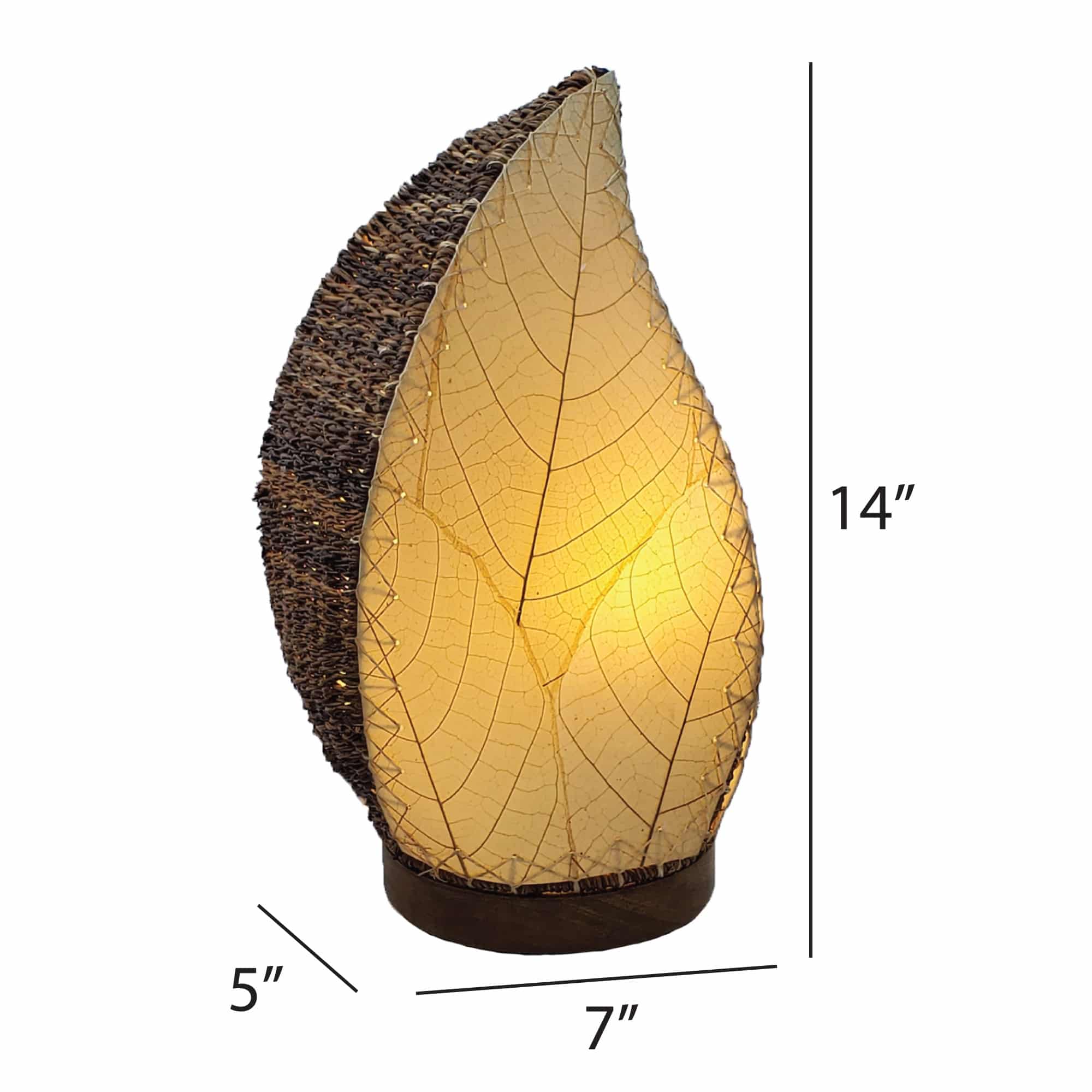 Each lamp is crafted by hand, starting with real fossilized cocoa leaves selected for their graceful structure and delicate vein patterns. Two panels are formed from these preserved leaves and stitched onto a wrought iron frame using abaca twine, while the third side offers a stunning contrast: a handwoven mesh made from renewable abaca fiber. It’s all anchored by a base of reclaimed mango wood—earthy, solid, and sustainably sourced.