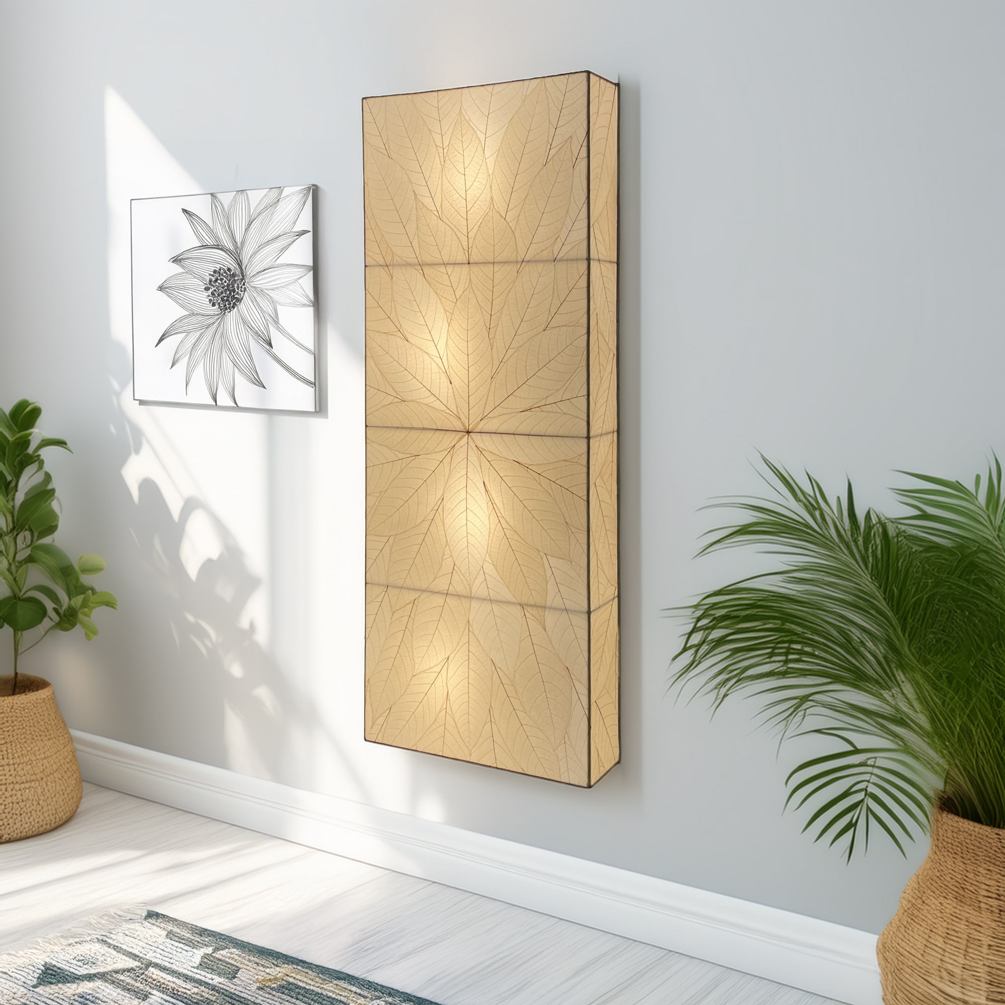 Each leaf is carefully selected, dyed with non-toxic pigments, and hand-placed by artisans in the Philippines using fair-trade practices. The result is a living texture—natural veins glowing softly beneath the surface, each panel uniquely shaped by nature’s hand. The seamless, hidden frame lets the pattern speak for itself, while its horizontal or vertical orientation adapts to your space and rhythm.
