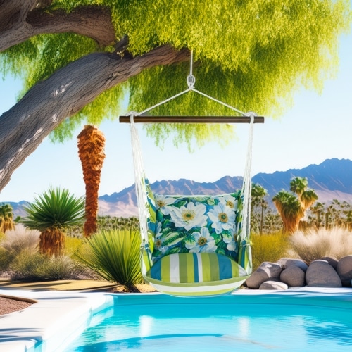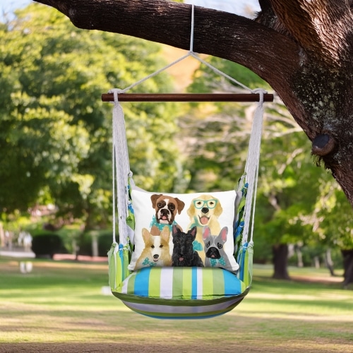 | Additional Parts | 4-piece Serene Sunset Swing Set: swing with wood bar, one 24×24 in. stuffed seat pillow, one 19×24 in. back pillow and one tote bag for indoor / outdoor use. Pillow inserts are included. Insert is 100% polyester. Zipper closure on pillow for easy removal. Swing can be mounted to a tree or a sturdy beam in a ceiling or porch. Hanging hardware sold separately. |