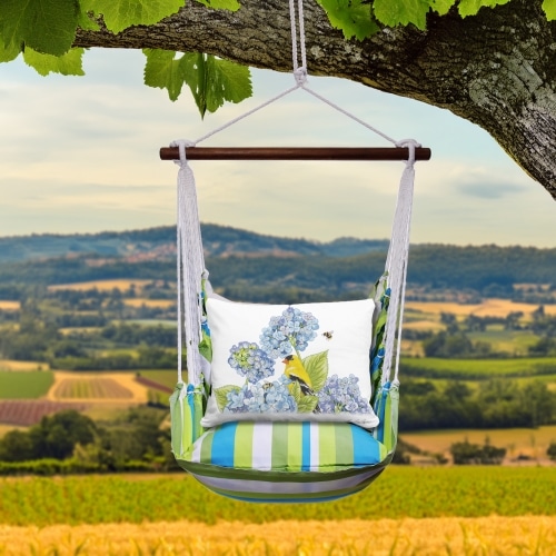 A friendly bumblebee hovers among delicate greenery, reminding you how even tiny moments can sweeten the day. The seat’s fresh blue-green stripe invites springtime vibes year-round, and artisan craftsmanship keeps seams strong through countless porch conversations. Sit back and let the gentle hum of nature inspire your next pause. Includes a swing with wood bar, a 24×24-inch stuffed seat pillow, a 19×24-inch back pillow and a tote bag for indoor / outdoor use, all in Sundure fabric (100 % polyester) that feels like cotton.
