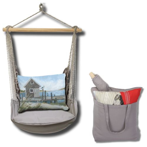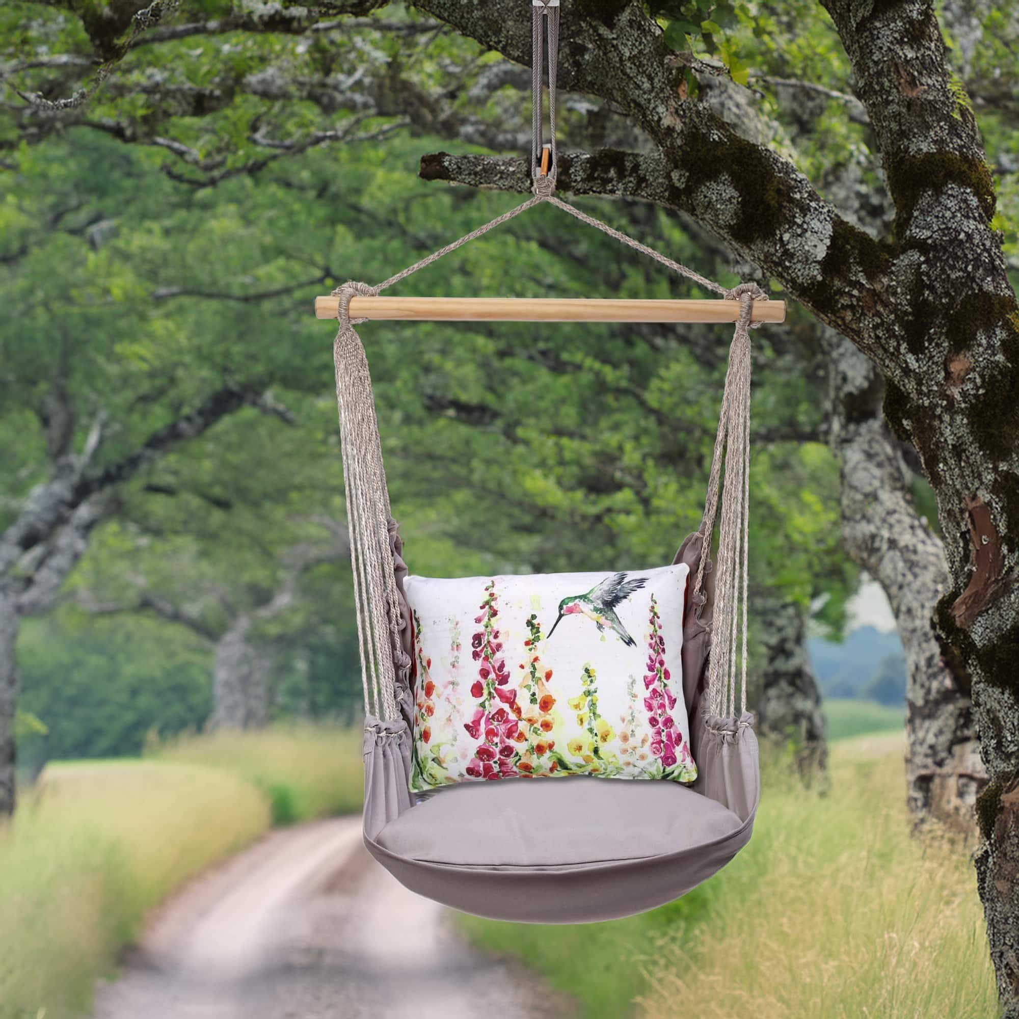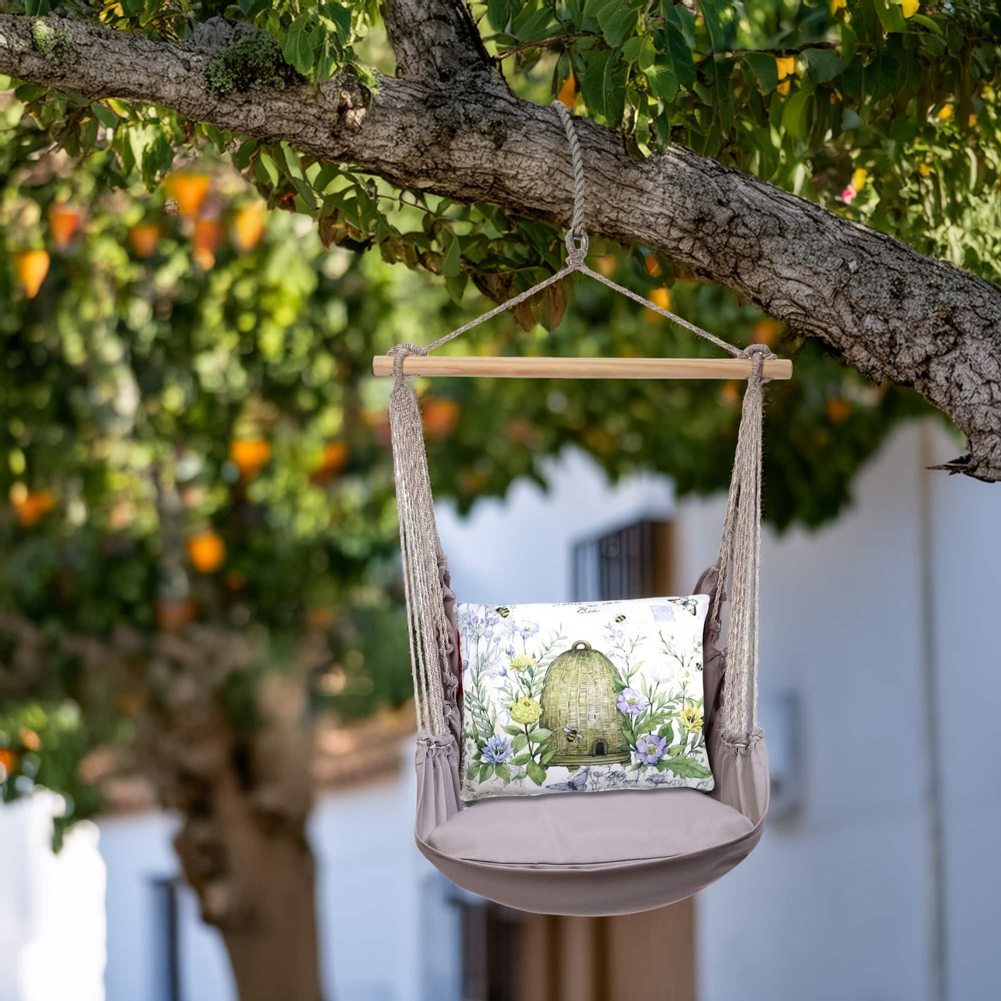 | Additional Parts | 4-piece Serene Sunset Swing Set: swing with wood bar, one 24×24 in. stuffed seat pillow, one 19×24 in. back pillow and one tote bag for indoor / outdoor use. Pillow inserts are included. Insert is 100% polyester. Zipper closure on pillow for easy removal. Swing can be mounted to a tree or a sturdy beam in a ceiling or porch. Hanging hardware sold separately. |
