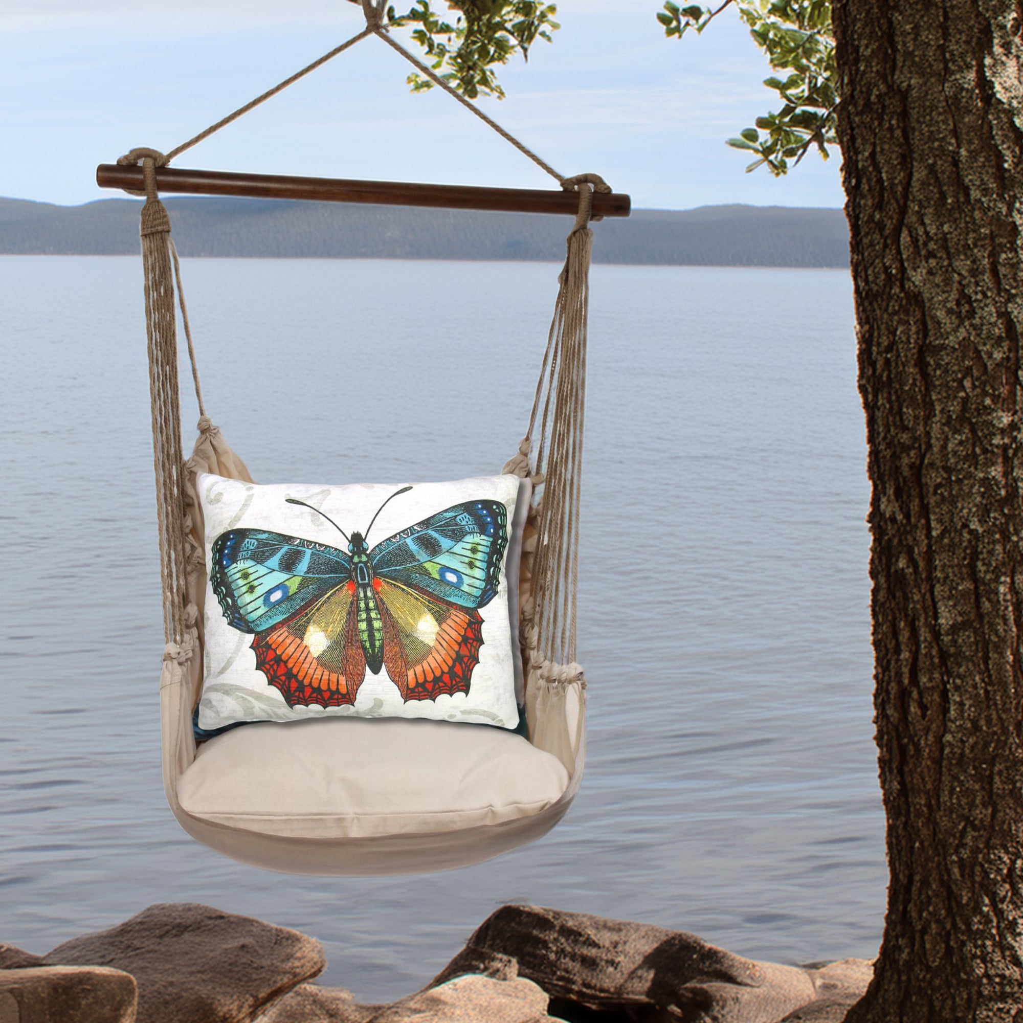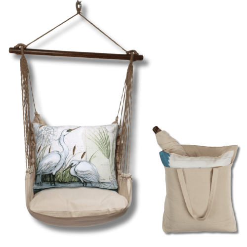 | Additional Parts | 4-piece Serene Sunset Swing Set: swing with wood bar, one 24×24 in. stuffed seat pillow, one 19×24 in. back pillow and one tote bag for indoor / outdoor use. Pillow inserts are included. Insert is 100% polyester. Zipper closure on pillow for easy removal. Swing can be mounted to a tree or a sturdy beam in a ceiling or porch. Hanging hardware sold separately. |