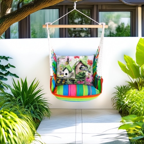| Additional Parts | 4-piece Serene Sunset Swing Set: swing with wood bar, one 24×24 in. stuffed seat pillow, one 19×24 in. back pillow and one tote bag for indoor / outdoor use. Pillow inserts are included. Insert is 100% polyester. Zipper closure on pillow for easy removal. Swing can be mounted to a tree or a sturdy beam in a ceiling or porch. Hanging hardware sold separately. |