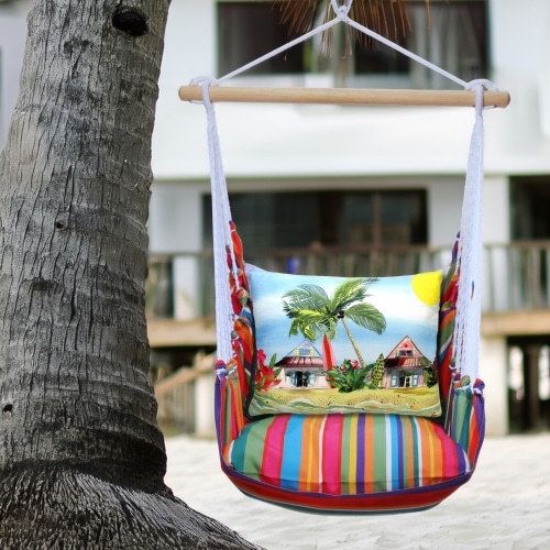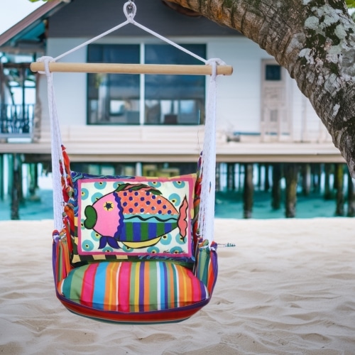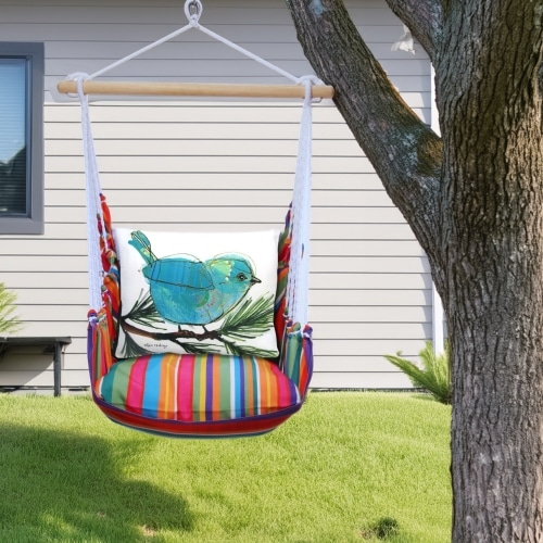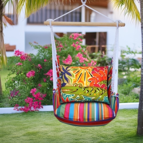 | Additional Parts | 4-piece Serene Sunset Swing Set: swing with wood bar, one 24×24 in. stuffed seat pillow, one 19×24 in. back pillow and one tote bag for indoor / outdoor use. Pillow inserts are included. Insert is 100% polyester. Zipper closure on pillow for easy removal. Swing can be mounted to a tree or a sturdy beam in a ceiling or porch. Hanging hardware sold separately. |
