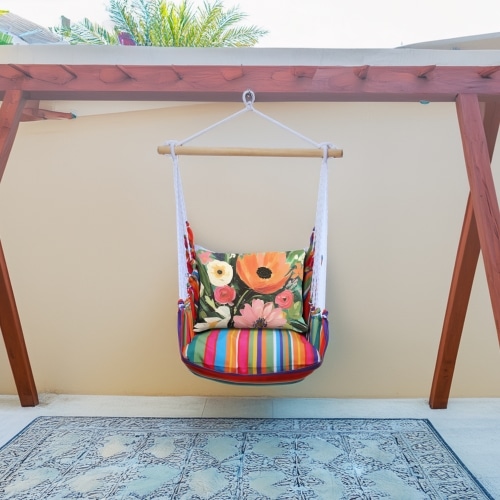 Envision a breezy corner of your yard where le jardin stripe invites daydreams and gentle conversation. A Vivid Flamingo Pink cushion adds its own personality, turning the swing into functional art. Hand-sewn from Sundure fabric that feels like cotton yet resists fade, mildew, and sudden showers, each set is built for real life outside so you can linger without fussing over the weather. A smoothly finished hardwood bar keeps the seat open and balanced, while durable hanging ropes clip up in moments and fold flat for off-season storage. The four-piece kit arrives ready to relax: swing seat, overstuffed 24×24-inch seat pillow, 19×24-inch back pillow, and a matching tote for easy travel or winter stow-away. Machine-washable and mood-lifting, it’s the quickest way to add a touch of crafted comfort wherever you hang it.