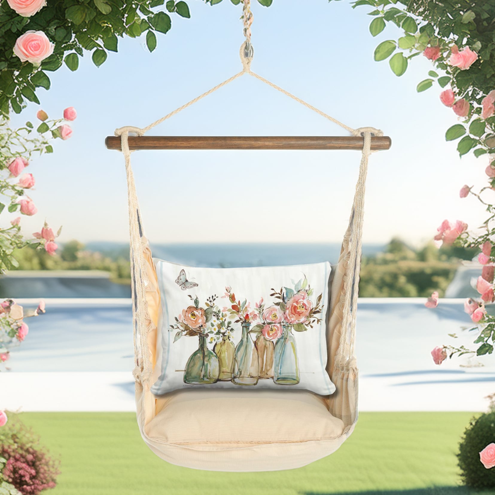| Additional Parts | 4-piece Serene Sunset Swing Set: swing with wood bar, one 24×24 in. stuffed seat pillow, one 19×24 in. back pillow and one tote bag for indoor / outdoor use. Pillow inserts are included. Insert is 100% polyester. Zipper closure on pillow for easy removal. Swing can be mounted to a tree or a sturdy beam in a ceiling or porch. Hanging hardware sold separately. |