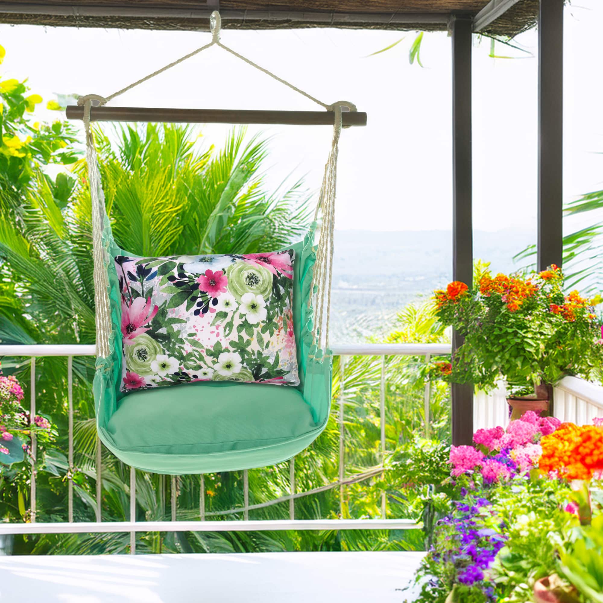 Think of weekend mornings when seafoam green solid turns the porch into a private retreat. A Meadow Dance 2 cushion adds its own personality, turning the swing into functional art. Hand-sewn from Sundure fabric that feels like cotton yet resists fade, mildew, and sudden showers, each set is built for real life outside so you can linger without fussing over the weather. A smoothly finished hardwood bar keeps the seat open and balanced, while durable hanging ropes clip up in moments and fold flat for off-season storage. The four-piece kit arrives ready to relax: swing seat, overstuffed 24×24-inch seat pillow, 19×24-inch back pillow, and a matching tote for easy travel or winter stow-away. Machine-washable and mood-lifting, it’s the quickest way to add a touch of crafted comfort wherever you hang it.