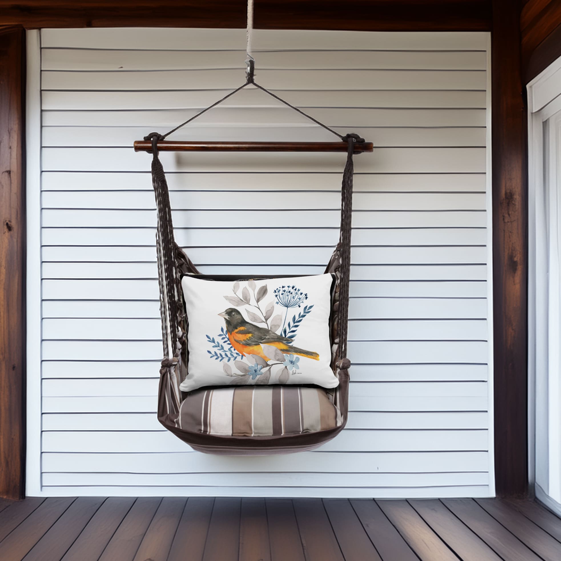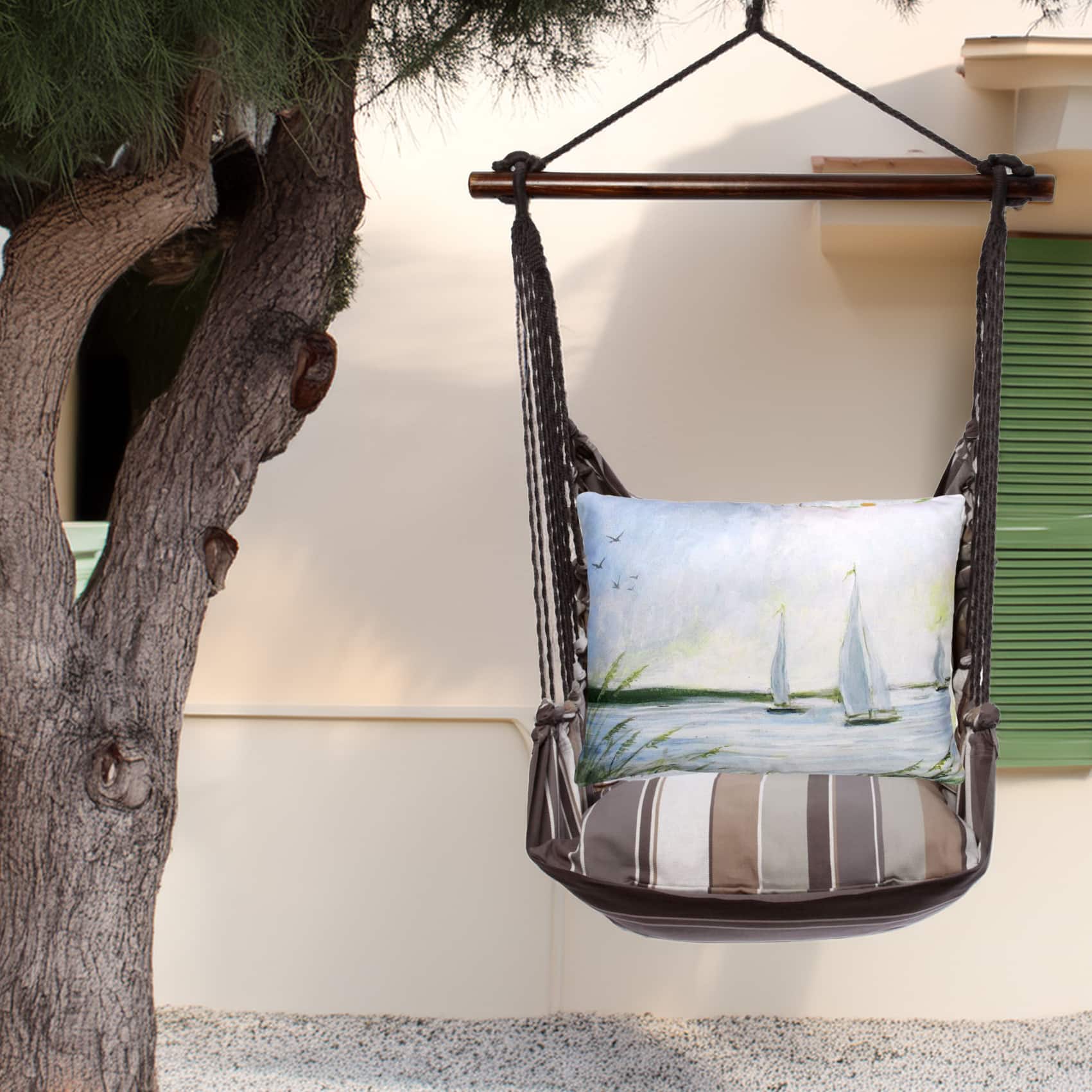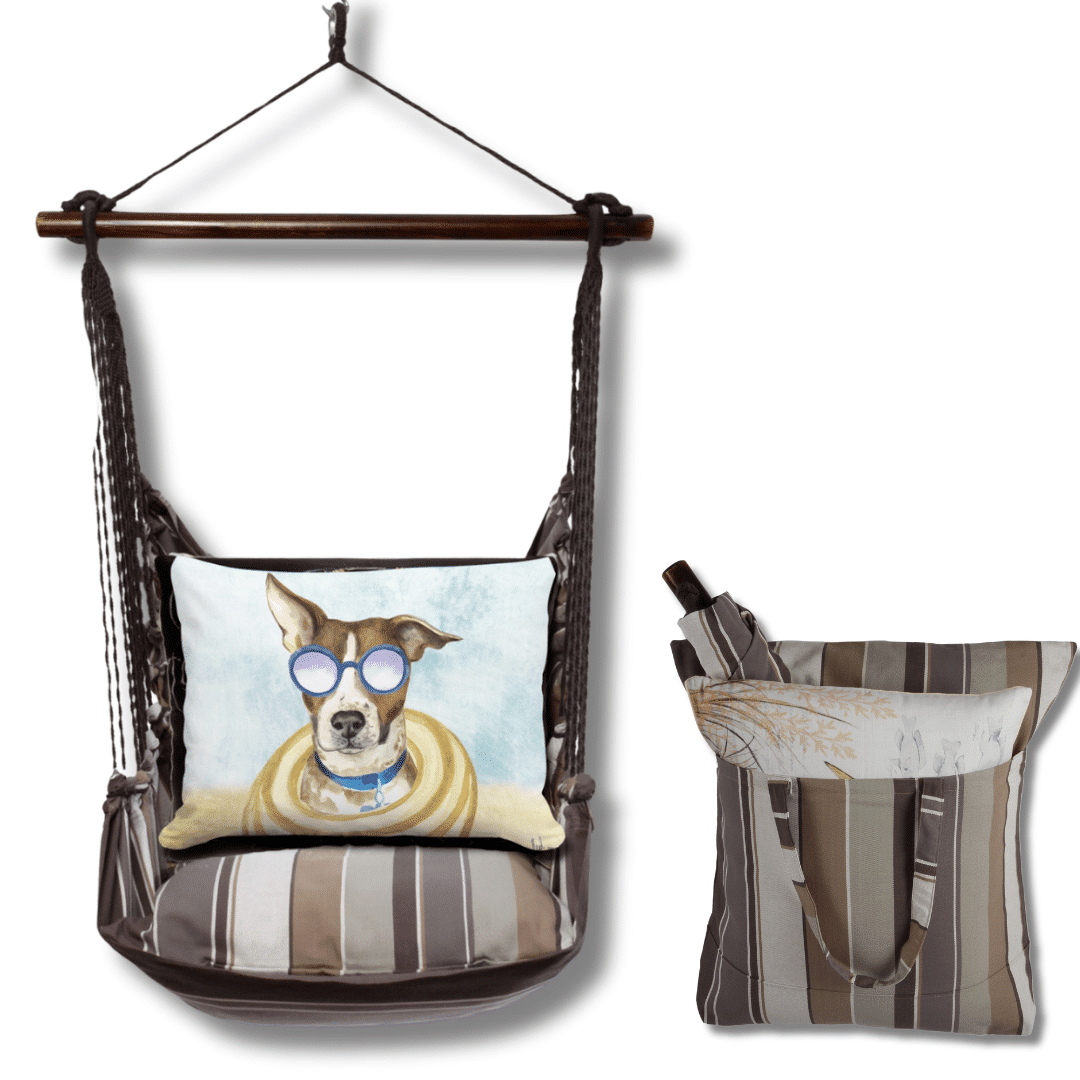 Think of weekend mornings when slate gray stripe turns the porch into a private retreat. A Good Chick cushion adds its own personality, turning the swing into functional art. Hand-sewn from Sundure fabric that feels like cotton yet resists fade, mildew, and sudden showers, each set is built for real life outside so you can linger without fussing over the weather. A smoothly finished hardwood bar keeps the seat open and balanced, while durable hanging ropes clip up in moments and fold flat for off-season storage. The four-piece kit arrives ready to relax: swing seat, overstuffed 24×24-inch seat pillow, 19×24-inch back pillow, and a matching tote for easy travel or winter stow-away. Machine-washable and mood-lifting, it’s the quickest way to add a touch of crafted comfort wherever you hang it.