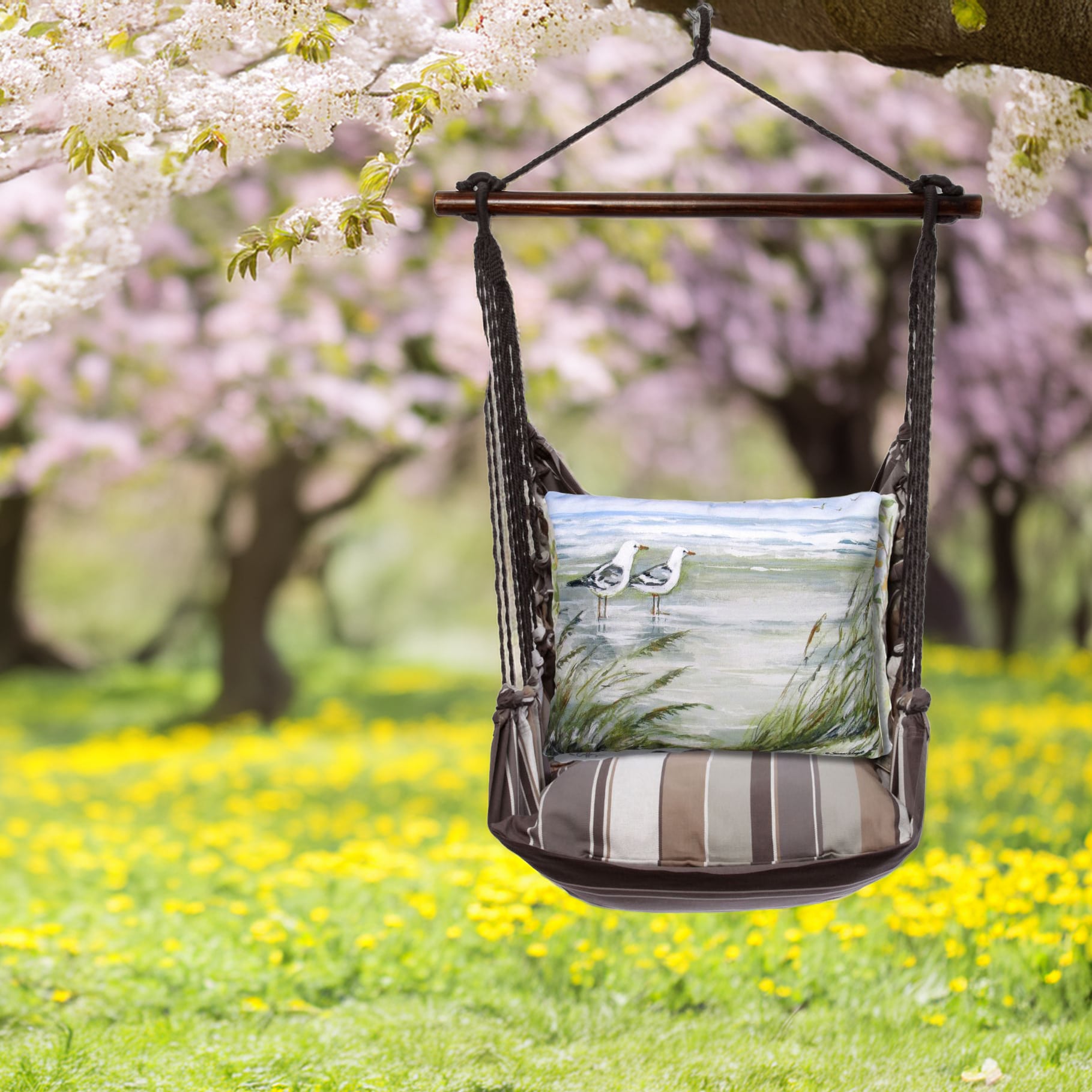 | Additional Parts | 4-piece Serene Sunset Swing Set: swing with wood bar, one 24×24 in. stuffed seat pillow, one 19×24 in. back pillow and one tote bag for indoor / outdoor use. Pillow inserts are included. Insert is 100% polyester. Zipper closure on pillow for easy removal. Swing can be mounted to a tree or a sturdy beam in a ceiling or porch. Hanging hardware sold separately. |