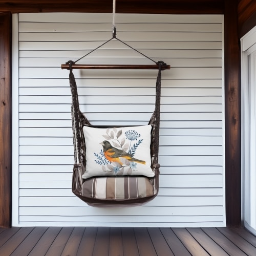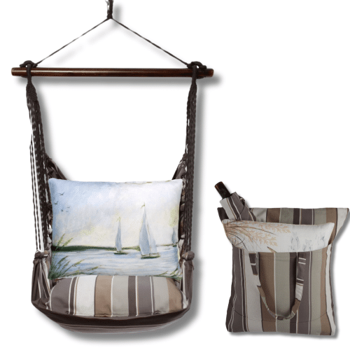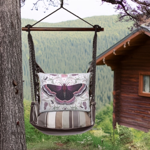 | Additional Parts | 4-piece Serene Sunset Swing Set: swing with wood bar, one 24×24 in. stuffed seat pillow, one 19×24 in. back pillow and one tote bag for indoor / outdoor use. Pillow inserts are included. Insert is 100% polyester. Zipper closure on pillow for easy removal. Swing can be mounted to a tree or a sturdy beam in a ceiling or porch. Hanging hardware sold separately. |
