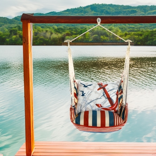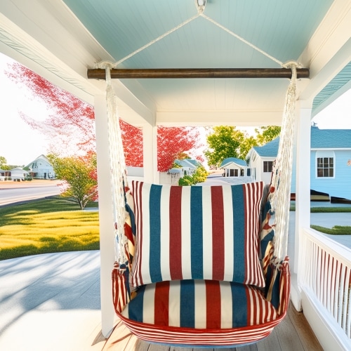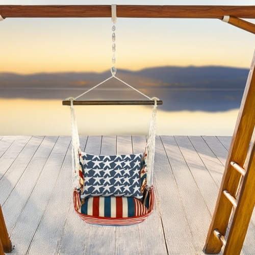 Picture a slow porch afternoon where stars & stripes frames every laugh and lazy sip of iced tea. A Americana Birdhouses cushion adds its own personality, turning the swing into functional art. Hand-sewn from Sundure fabric that feels like cotton yet resists fade, mildew, and sudden showers, each set is built for real life outside so you can linger without fussing over the weather. A smoothly finished hardwood bar keeps the seat open and balanced, while durable hanging ropes clip up in moments and fold flat for off-season storage. The four-piece kit arrives ready to relax: swing seat, overstuffed 24×24-inch seat pillow, 19×24-inch back pillow, and a matching tote for easy travel or winter stow-away. Machine-washable and mood-lifting, it’s the quickest way to add a touch of crafted comfort wherever you hang it.