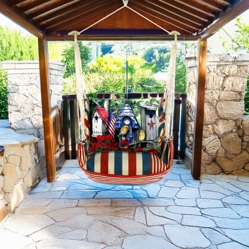 Picture a slow porch afternoon where stars & stripes frames every laugh and lazy sip of iced tea. A Birdhouses & Flowers cushion adds its own personality, turning the swing into functional art. Hand-sewn from Sundure fabric that feels like cotton yet resists fade, mildew, and sudden showers, each set is built for real life outside so you can linger without fussing over the weather. A smoothly finished hardwood bar keeps the seat open and balanced, while durable hanging ropes clip up in moments and fold flat for off-season storage. The four-piece kit arrives ready to relax: swing seat, overstuffed 24×24-inch seat pillow, 19×24-inch back pillow, and a matching tote for easy travel or winter stow-away. Machine-washable and mood-lifting, it’s the quickest way to add a touch of crafted comfort wherever you hang it.